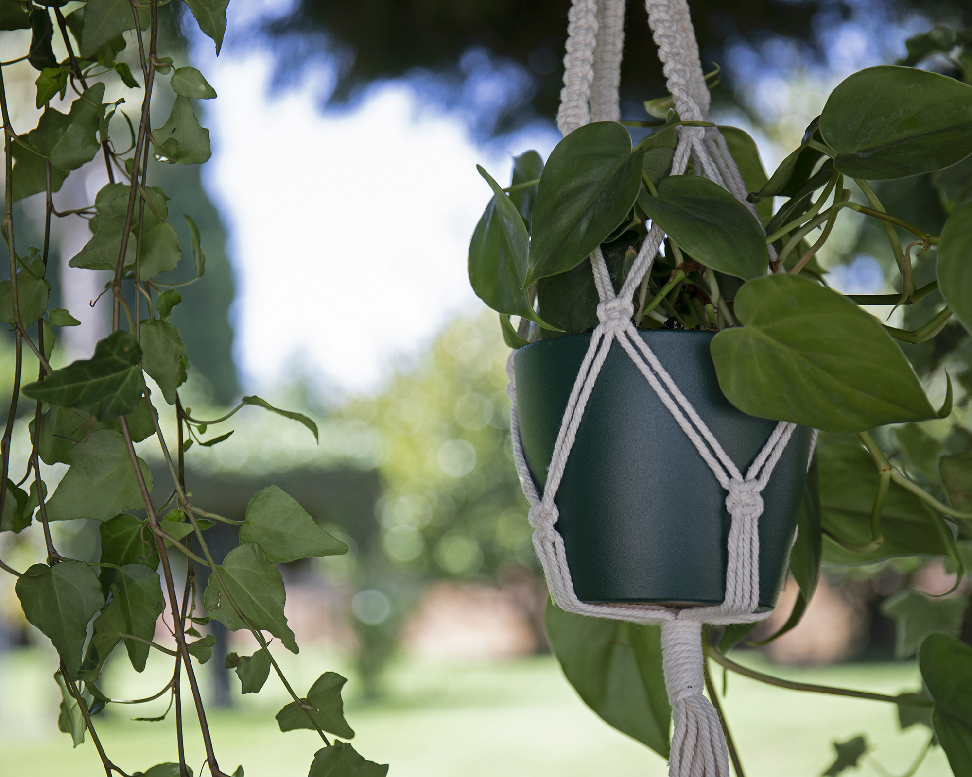 Suporte macramé com nó espiral simples, indicado para uso exterior e interior. 100% algodão, fácil de aplicar e feito à mão. Inclui ganchos de fixação.